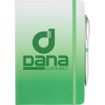 The 6" x 8.5" Gradient Bound Notebook features 80 sheets of white, ruled paper and a matching colored closure with a ribbon and an elastic pen loop.