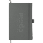 Fabric, hard cover journal. Exposed stitched spine allows for a lay flat note taking experience. 72 sheets of white lined paper and 8 sheets of blank cool gray colored pages for seamless notetaking. Color matching elastic closure, pen loop and ribbon page marker.