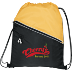 The Railway Drawstring Bag has an open main compartment with a cinching rope closure. The zippered front pocket includes an earbud port.