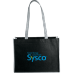 Perfect alternative to plastic bags. Open main compartment. Side pocket. Reinforced contrast handles, binding and gusset. 14" handle drop height.