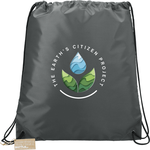 The Oriole RPET Drawstring Bag includes an open main compartment with a cinching rope closure and reinforced bottom corner tabs. This bag is manufactured from 100% recycled 210d polyester, made from water bottles. Through a partnership with 1% For The Planet one percent of sales of this and all EcoSmart products will be donated to nonprofits dedicated to protecting the planet.