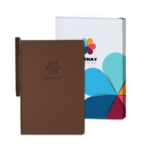 Elevate your brand with this semi custom bound journal. Features a built in elastic closure, ribbon page marker, document pocket on back cover and 80 sheets of cream lined paper. Customizable full color tuck gift box, blind deboss decoration on journal (1921-09) and decoration on pen (6620-31) included in pricing.