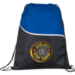 The Wave Drawstring Bag has an open main compartment with a pen loop, a large front slash pocket and a cinching closure.