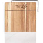 This sleek and elegant acacia wood and marble cheese cutting board with stainless steel handle and blade is perfect for entertaining at home. The on trend combination adds a touch of style and elegance to any party. Acacia wood measures 7.87" x 8.66" and marble measures 3.15" x 8.66". Due to the nature of the materials variations in marble pattern and laser imprint will occur.