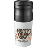 With this portable innovative coffee maker, you can truly enjoy your coffee anytime, anywhere! Coffee grinder with powerful electric motor quickly and quietly grinds coffee beans to your desired texture, either for french press or finely powdered espresso. In just seconds, the fresh-ground taste is right at your fingertips. With the built-in stainless steel filter and the copper vacuum insulated stainless cup, you can drip your coffee right away. Screw the lid on with flap sealing closure to keep your coffee hot for at least 8 hours. Cup itself fits most standard K cup coffee machines. Stylish design with multiple functions makes this item the perfect gift. Leed's Exclusive. 14oz.
