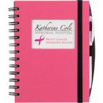 Die-cut window cover reveals full-color, heavy, coated insert page. 100 sheets of spiral-bound lined paper. Built-in elastic pen loop. Elastic closure. Includes important contacts sheet and calendar. Pen is not included.