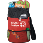The Fun-Sun Duffel Bag has an open main compartment with a cinch closure. A front mesh pocket with an elastic closure let you gain quick access to needed belongings. It also features a zippered compartment for a phone and credit cards, etc. The mesh bottom makes for quick and easy cleaning of sand, dirt, and crumbs – just shake. Plus the adjustable shoulder strap make carrying comfortable and convenient.