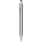 The Level and Ruler Ballpoint Stylus Pen features ruler markings on barrel and spirit level. Metallic finish with silver accents. Soft, rubber stylus. Click action mechanism. Black ink cartridge. Pen tip is 1.0mm.
